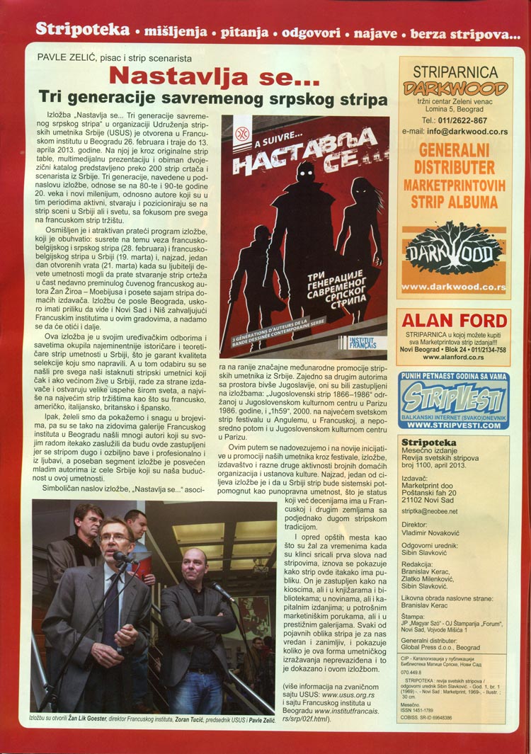 Изложба „Наставља се... Три генерације савреме-ног српског стрипа" у организацији Удружења стрип-ских уметника Србије (УСУС) је отворена у Француском институту у Београду 26. фебруара и траје до 13. априла 2013. године. На њој је кроз оригиналне стрип табле, мултимедијалну презентацију и обиман двојезични каталог представљено преко 200 стрип цртача и сценариста из Србије. Три генерације, наведене у поднаслову изложбе, односе се на 80-те и 90-те године 20. века и нови миленијум, односно ауторе који су у тим периодима активни, стварају и позиционирају се на стрип сцени у Србији али и свету, са фокусом пре свега на француском стрип тржишту.